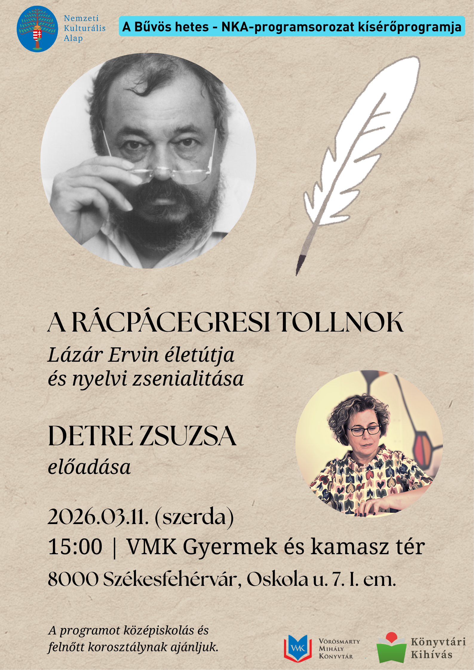 A március 11-én, kedden 15 órakor kezdődő előadásra a középiskolásokat és a felnőtteket várjuk szeretettel!