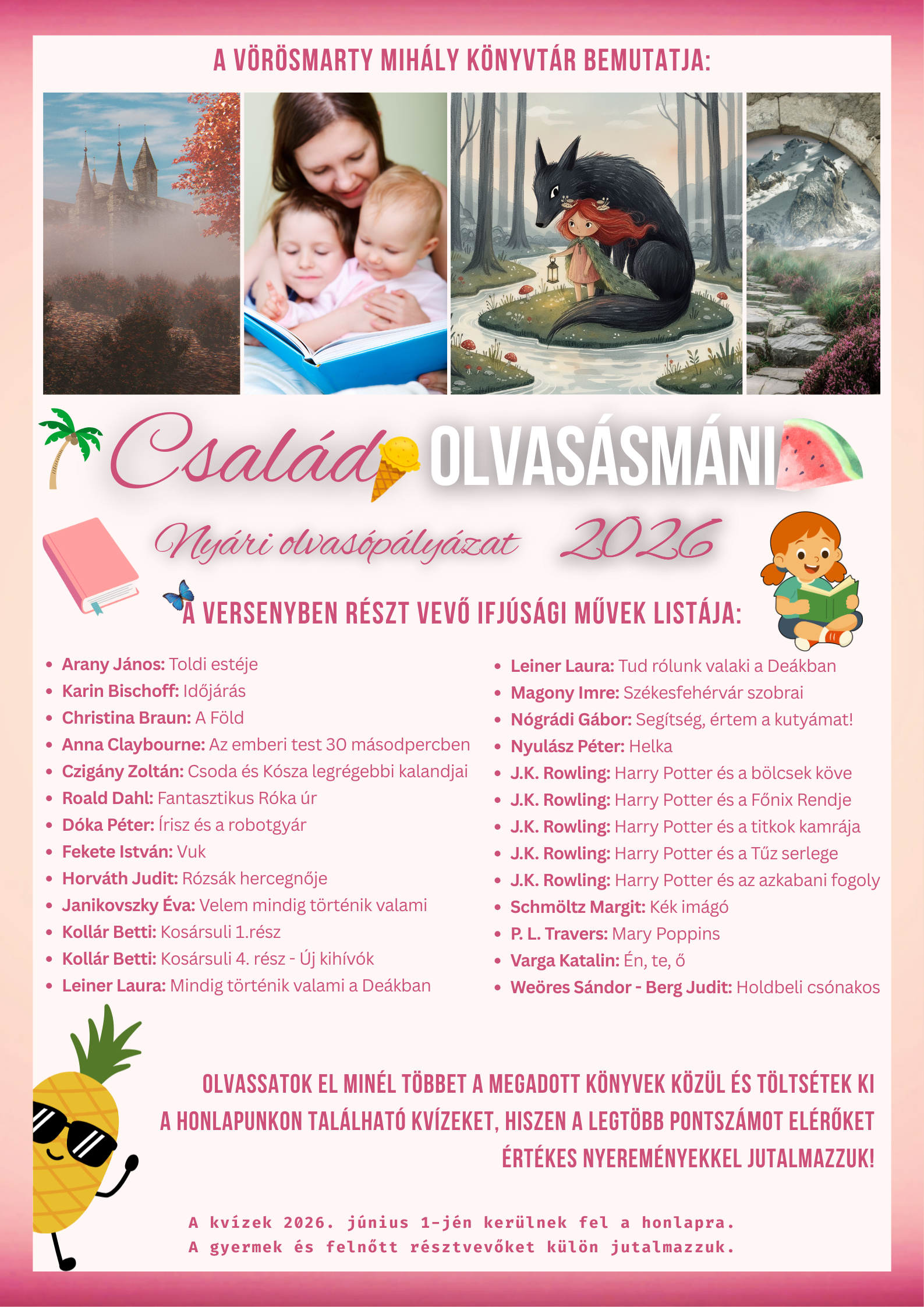 Már látható honlapunkon, hogy mely könyvekből lehet választani a nyári olvasópályázatunkhoz. A gyerekeknek, fiataloknak huszonhat művet ajánlunk. Töltsétek ki a kvízeket, és nyerjetek! :)
